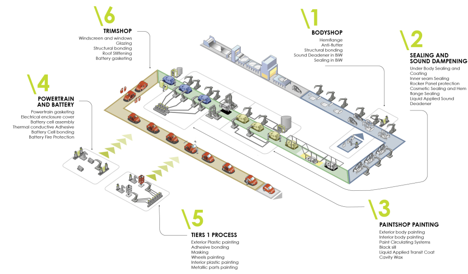Automotive markets includes Passenger Cars, Light Commercial Van. OEM manufacturers are globally installed with 10 to over 50 factories each. In the factory the process starts in the body shop for the body structure of the car and its doors and hood.