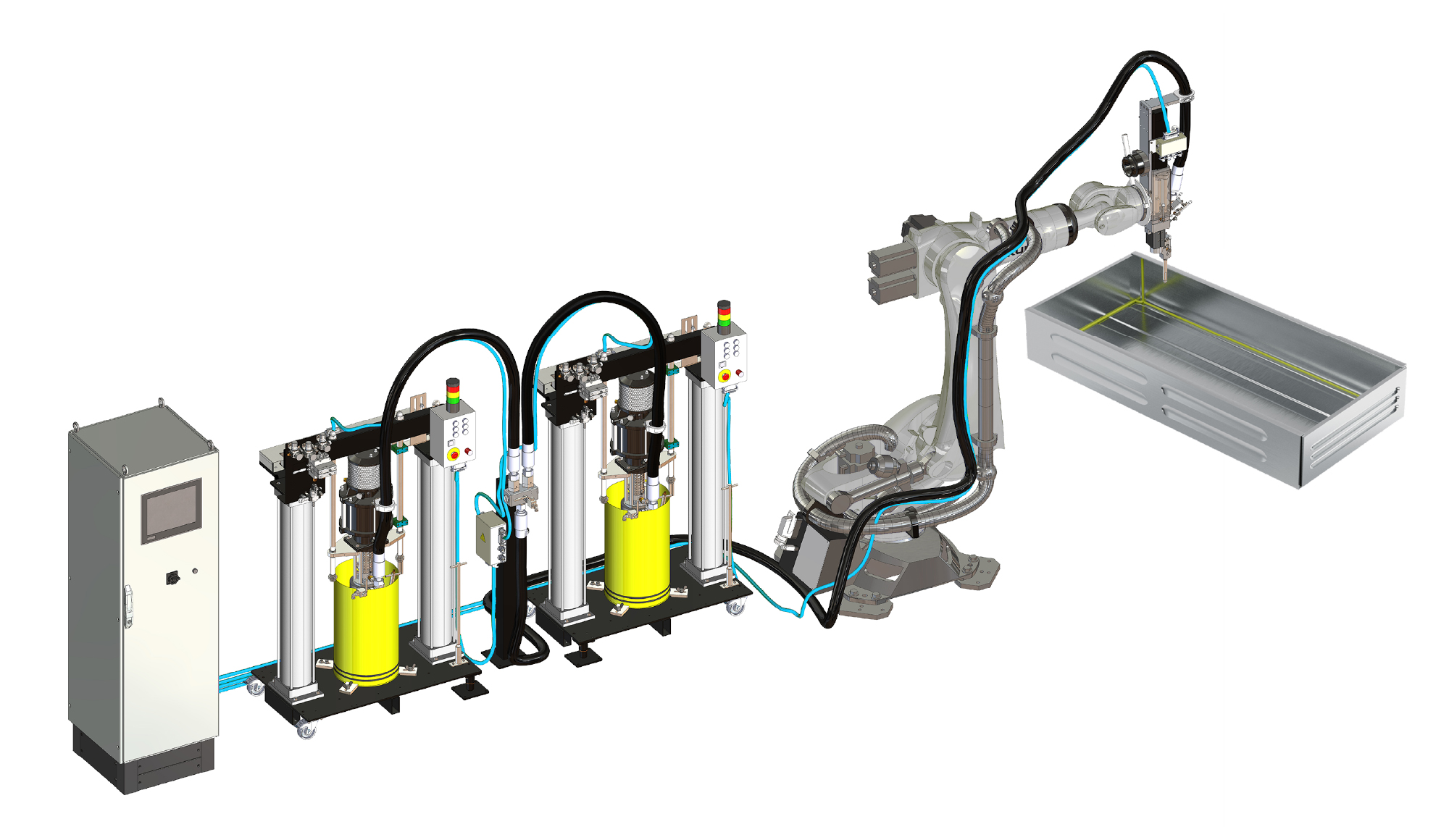The control cabinet manages the dosing unit, the dual ram unit pumping station, and any heating zone required to maintain material viscosity stable during dispensing.