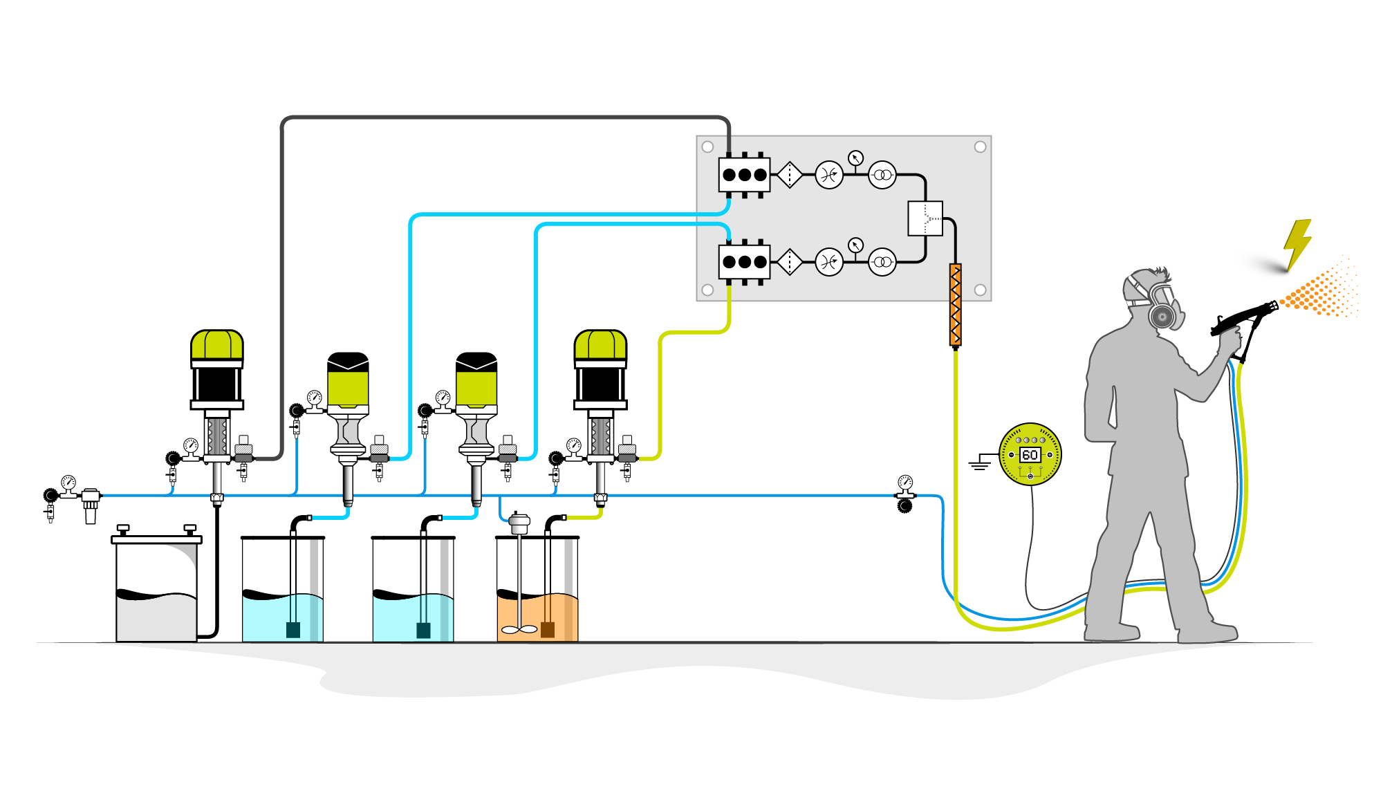 Our 2K mixing systems (Cyclomix® Evo or PU3000) proportion and mix only during spraying, guaranteeing fresh, homogeneous paint for superior finish. During application, the spray gun electrostatically charges paint droplets, attracting them to the surface for optimal coverage and efficiency.