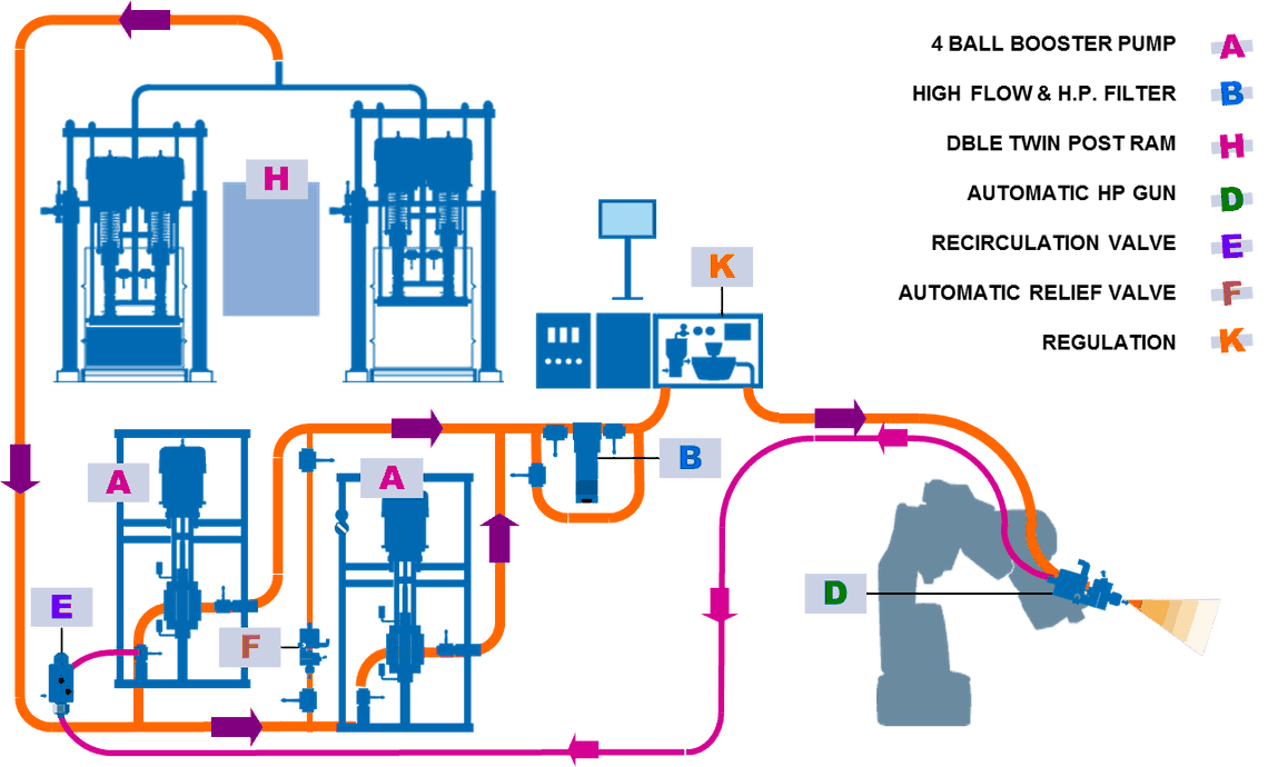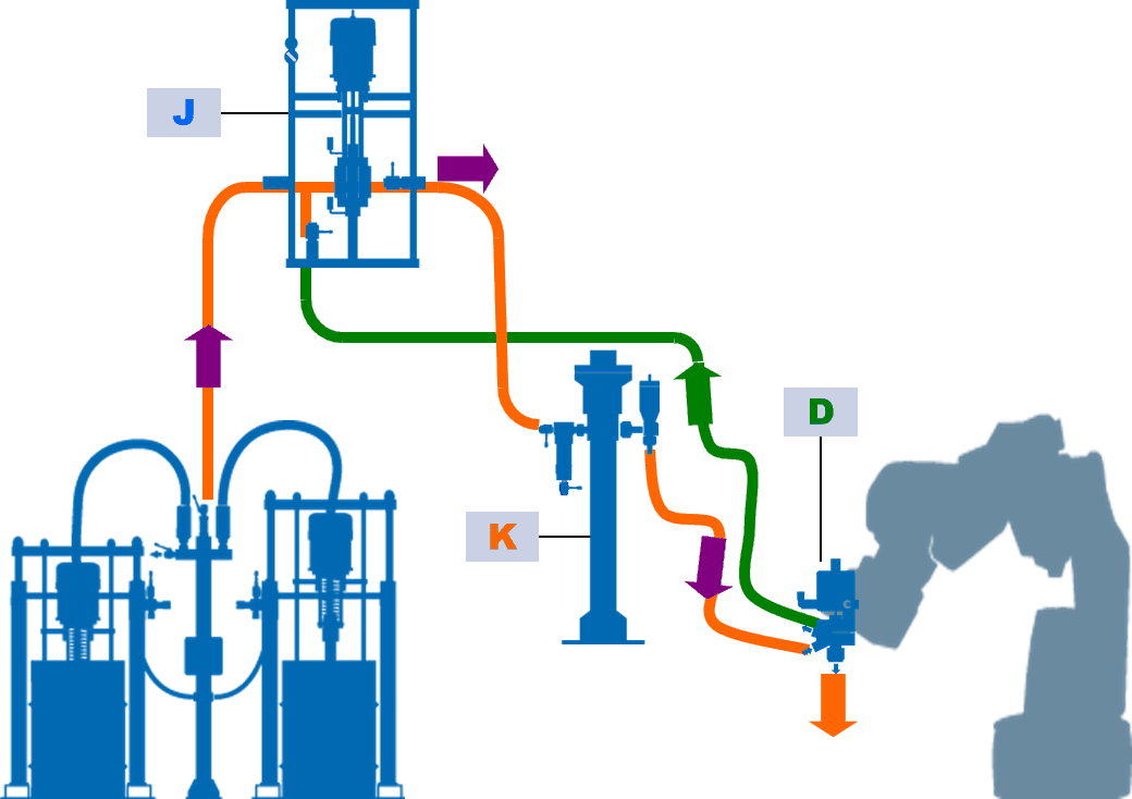 In the most demanding cases, we will use double supply system, each having a recirculation loop, with a close loop regulation on the material flow. Temperature control can also be included to manage perfectly the spray conditions and make sure that the material is delivered perfectly to the part.